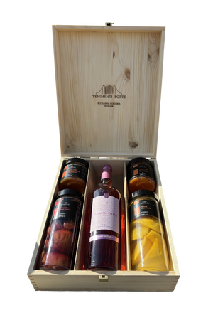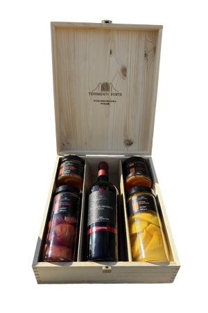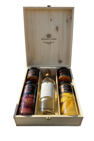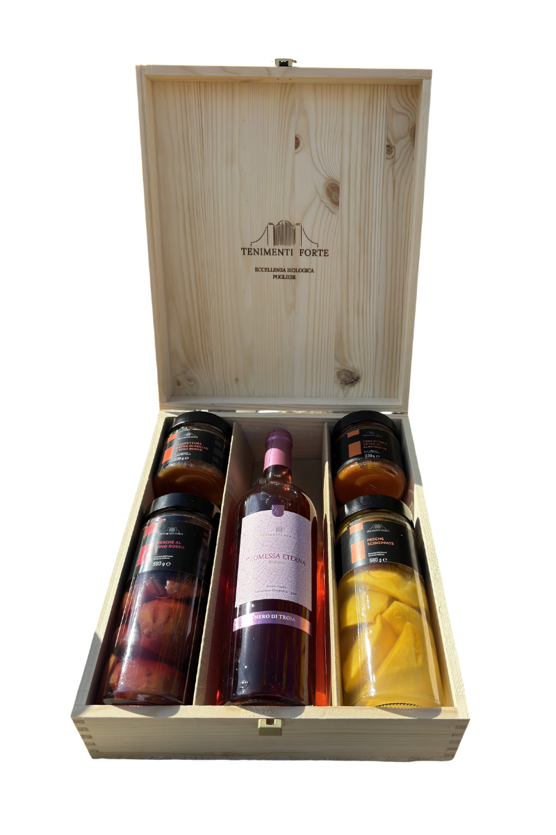 Regala una selezione bio, artigianale e genuina firmata Tenimenti Forte: il gusto vero della frutta lavorata con cura e un calice di vino da scegliere tra tre etichette. Il tutto in cassetta di legno riutilizzabile: autentica, elegante, pronta da donare.