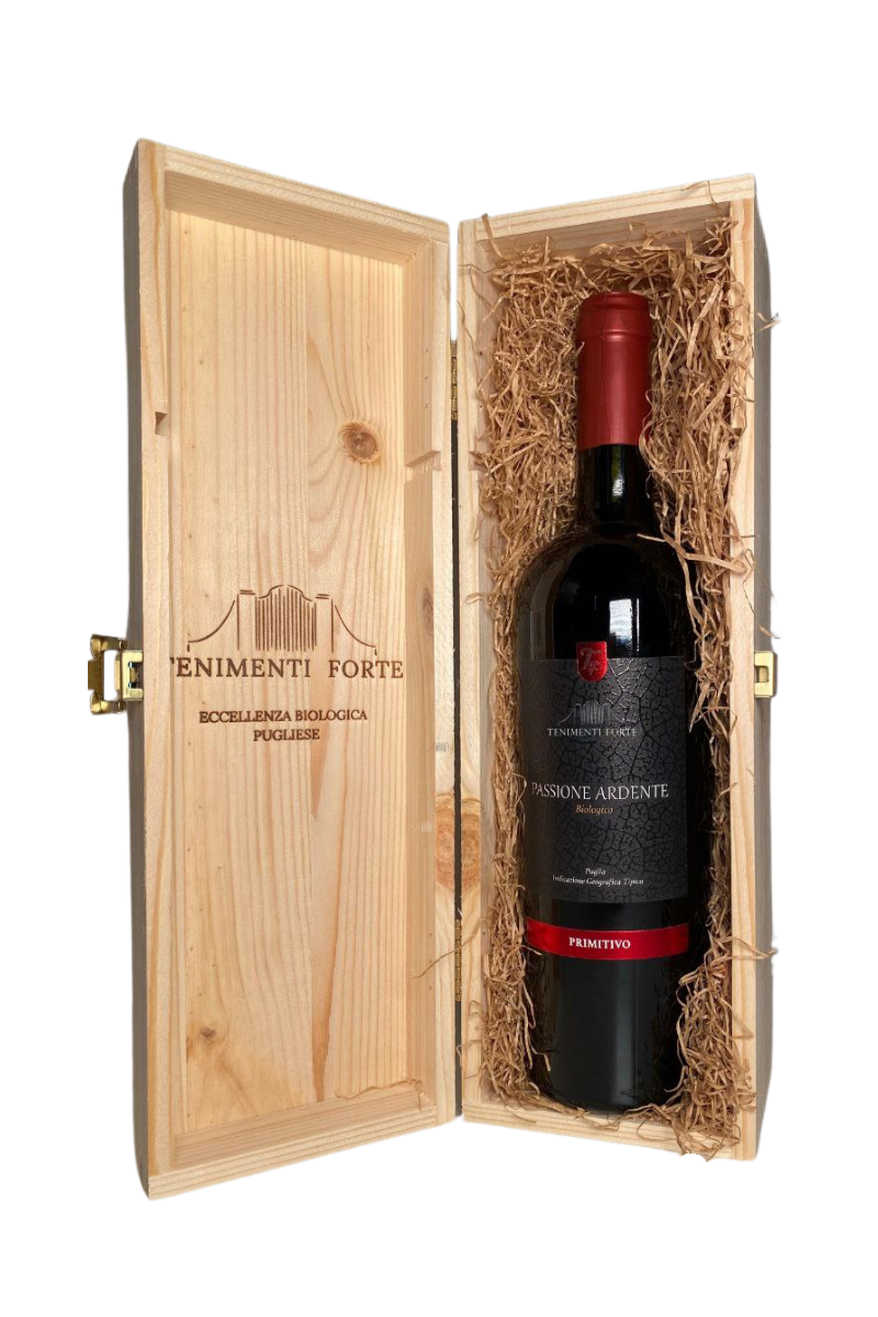 Passione Ardente - Il Cuore del Primitivo, un vino rosso Primitivo intenso e avvolgente, 100% Biologico e ricco di antiossidanti, dal colore rubino intenso e aromi di frutti rossi maturi. Al palato è corposo, con tannini vellutati che lo rendono perfetto per primi succulenti e serate conviviali.