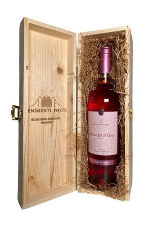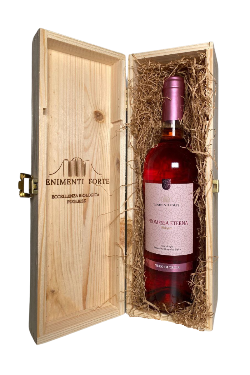 Promessa Eterna - La raffinatezza in Rosato, Un Nero di Troia rosato di annata, fresco e delicato, dal colore cerasuolo che richiama i tramonti pugliesi. 100% Biologico e ricco di antiossidati, dalle note di melograno e frutti di bosco, è un vino morbido e versatile, ideale per aperitivi, insalate o per accompagnare primi piatti più leggeri.