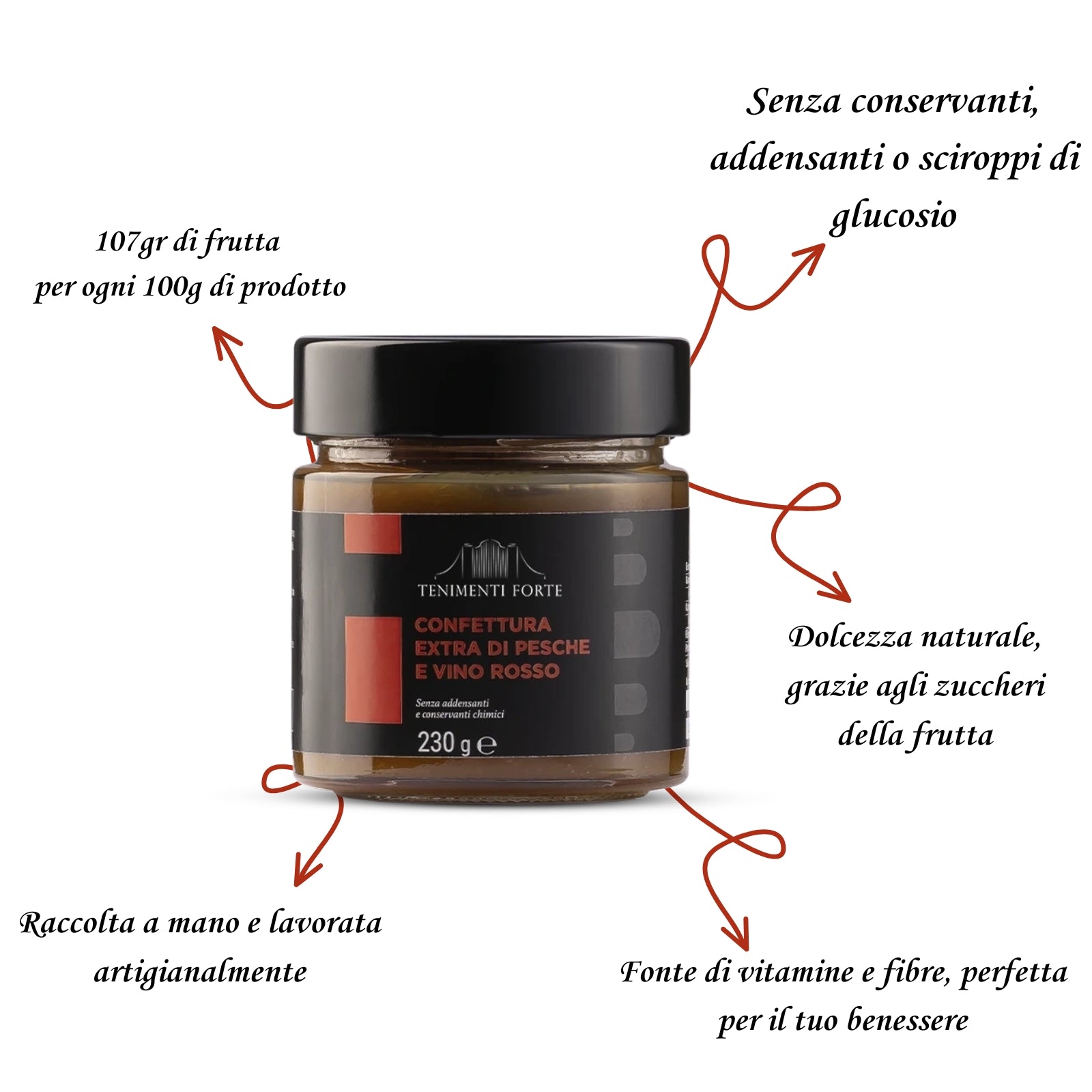 Tipologia: La confettura Extra di Pesche con Vino Rosso è realizzata con le nostre pesche coltivate nel rispetto della terra e dell’ambiente, rigorosamente bio.