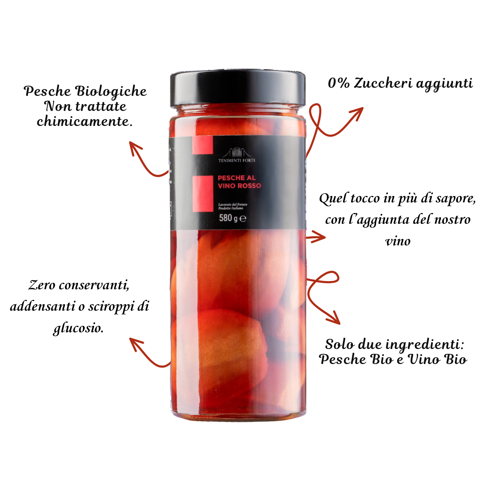 Valori nutrizionali: Con solo 72 kcal per 100 grammi, le Pesche al Vino Rosso sono una scelta gustosa e leggera. Offrono una dolcezza naturale grazie agli zuccheri naturali della frutta (5,2 g di carboidrati, di cui 4,8 g zuccheri). Ricche di fibre (1,3 g) e proteine (1,7 g) per il benessere intestinale e con un bassissimo contenuto di grassi (0,5 g), sono perfette per chi cerca un prodotto gustoso, sano e 100% naturale. Senza conservanti chimici, queste pesche garantiscono la qualità autentica della natura in ogni morso.