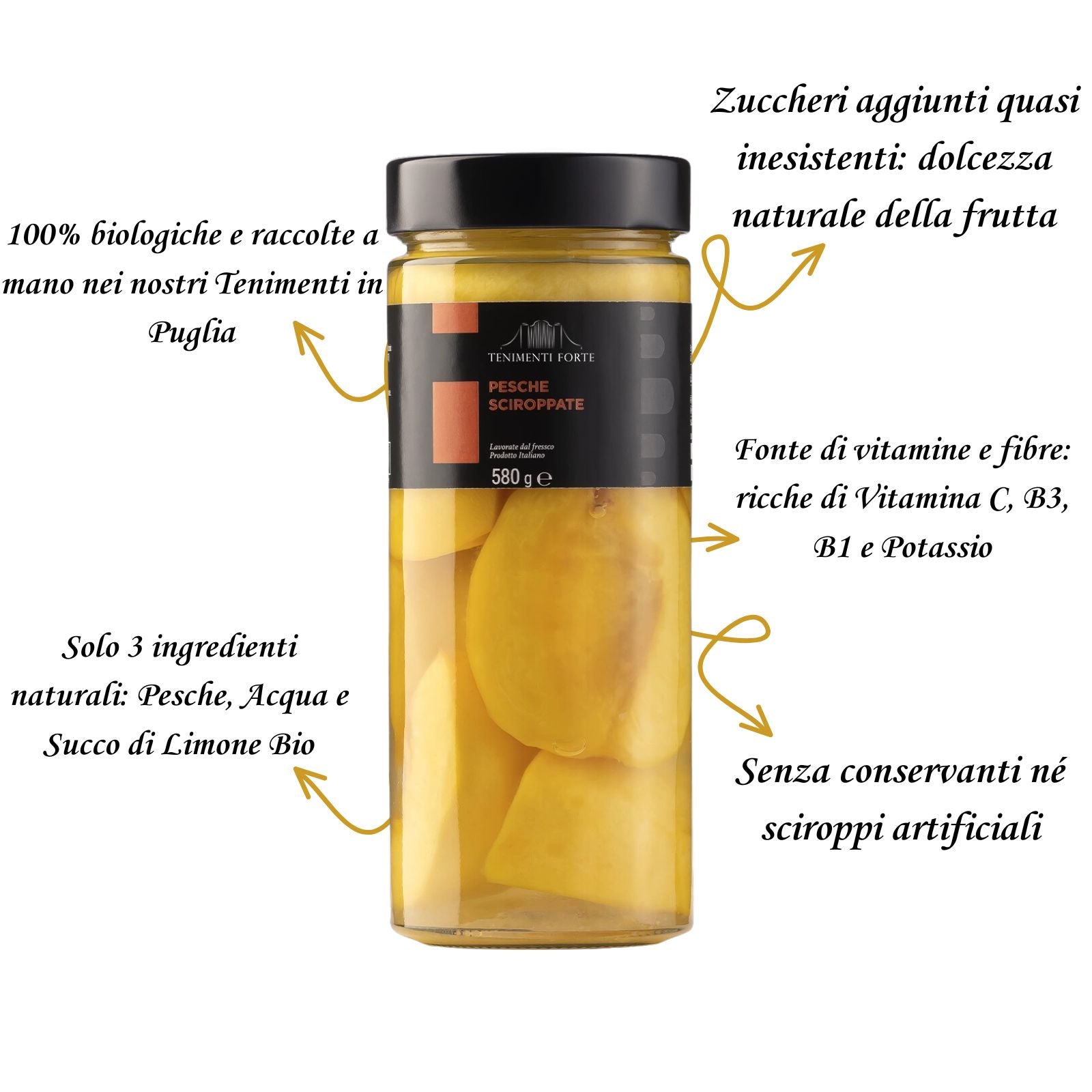 Valori nutrizionali per 100g: Con appena 71 kcal (297 kJ), sono una scelta leggera e nutriente, con lo 0% di grassi esse sono perfette per chi desidera un alimento gustoso e salutare. Senza glutine, senza conservanti né dolcificanti artificiali, queste pesche offrono una dolcezza naturale, grazie agli zuccheri naturali della frutta (18 g di carboidrati, di cui 14g zuccheri) e apportano vitamine (Vitamina C, B3, B1 e potassio) e fibre preziose (1,2 g) per il benessere intestinale. Ideali per chi cerca qualità e genuinità in ogni morso.